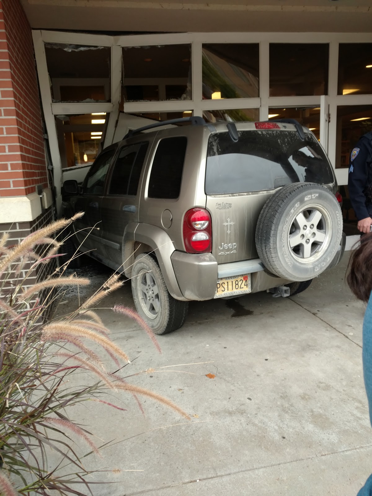Monday morning before the library opened...this happened. Thank goodness no one was injured, and the only damage was to the front door area of the building, but also the door to the meeting room there on the left side. The bottom glass area broke, so there was glass all over the carpet in the meeting room. The carpet has been vacuumed several times, but one of the ladies here could still see some sparkly bits in the carpet, and we just didn't want to take a chance with little ones on the carpet. Better safe than sorry.